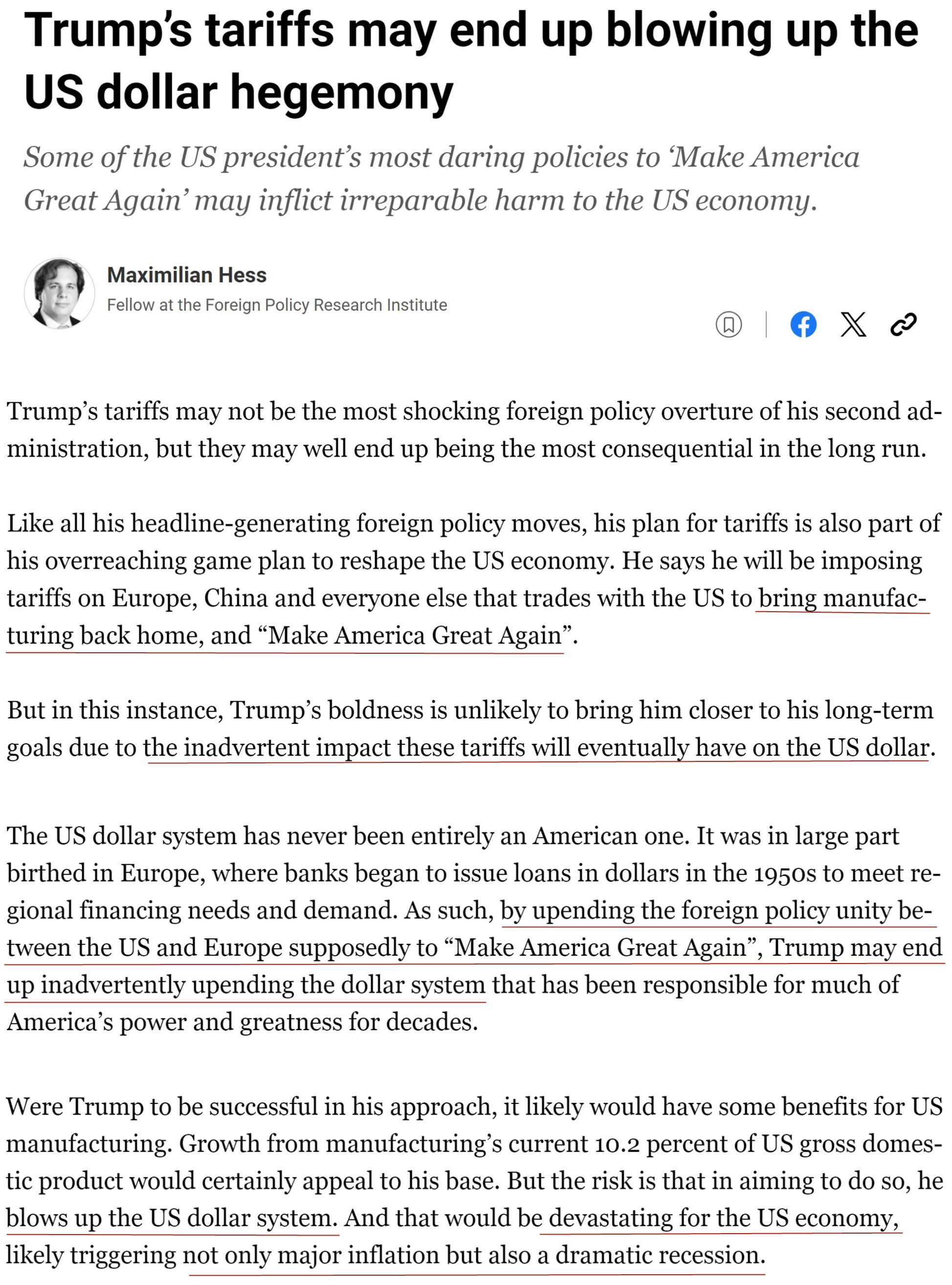 文章指出,一直以来,全球对美元的需求使其成为美国的主要出口产品。正是这种“过分的特权”使美国能够在不对经济造成重大负担的情况下长期维持贸易和财政赤字。而如今特朗普政府的关税政策可能最终摧毁美元霸权,从而使美国经济遭到毁灭性打击。
