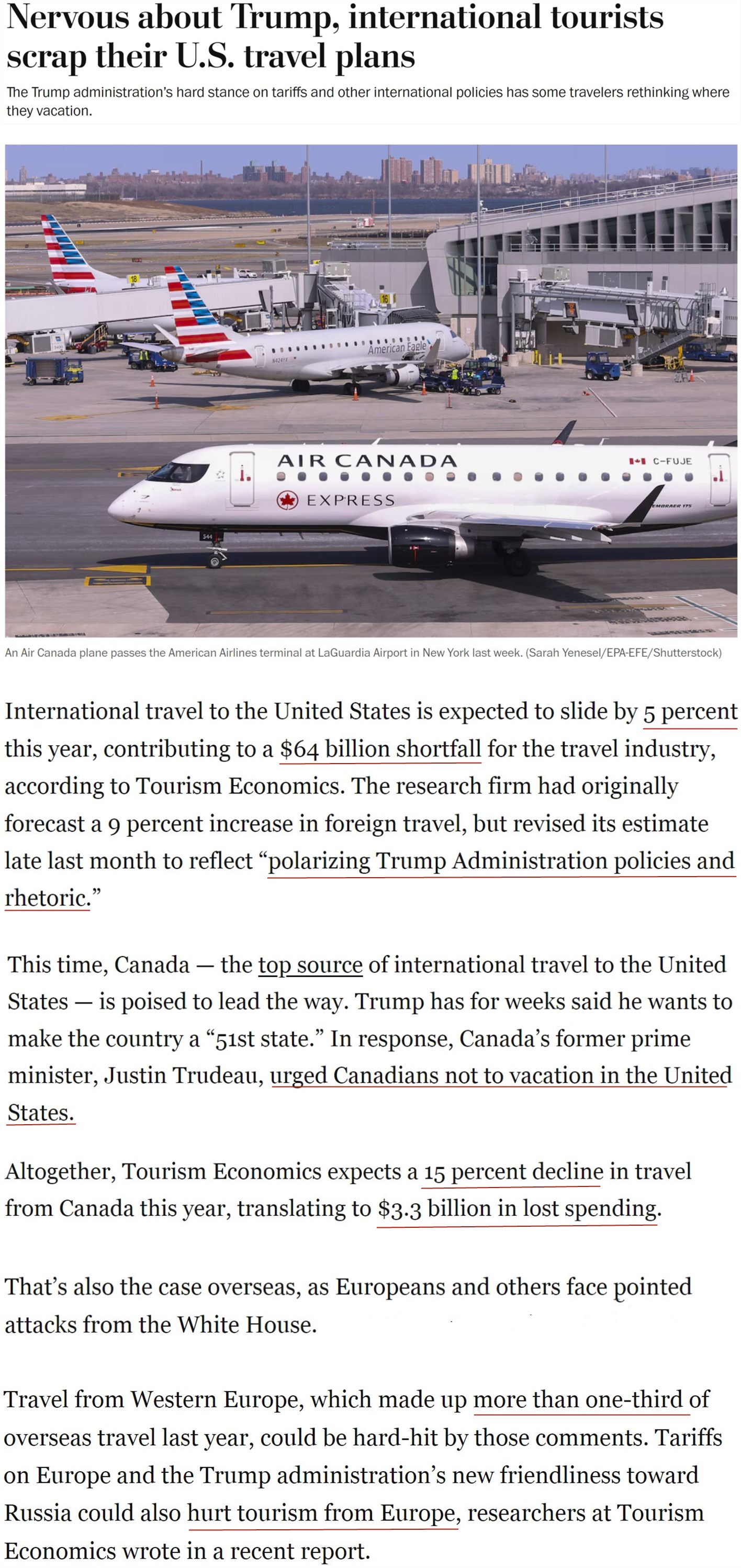或许更让美国始料未及的是,外国游客也被关税“气”跑了。