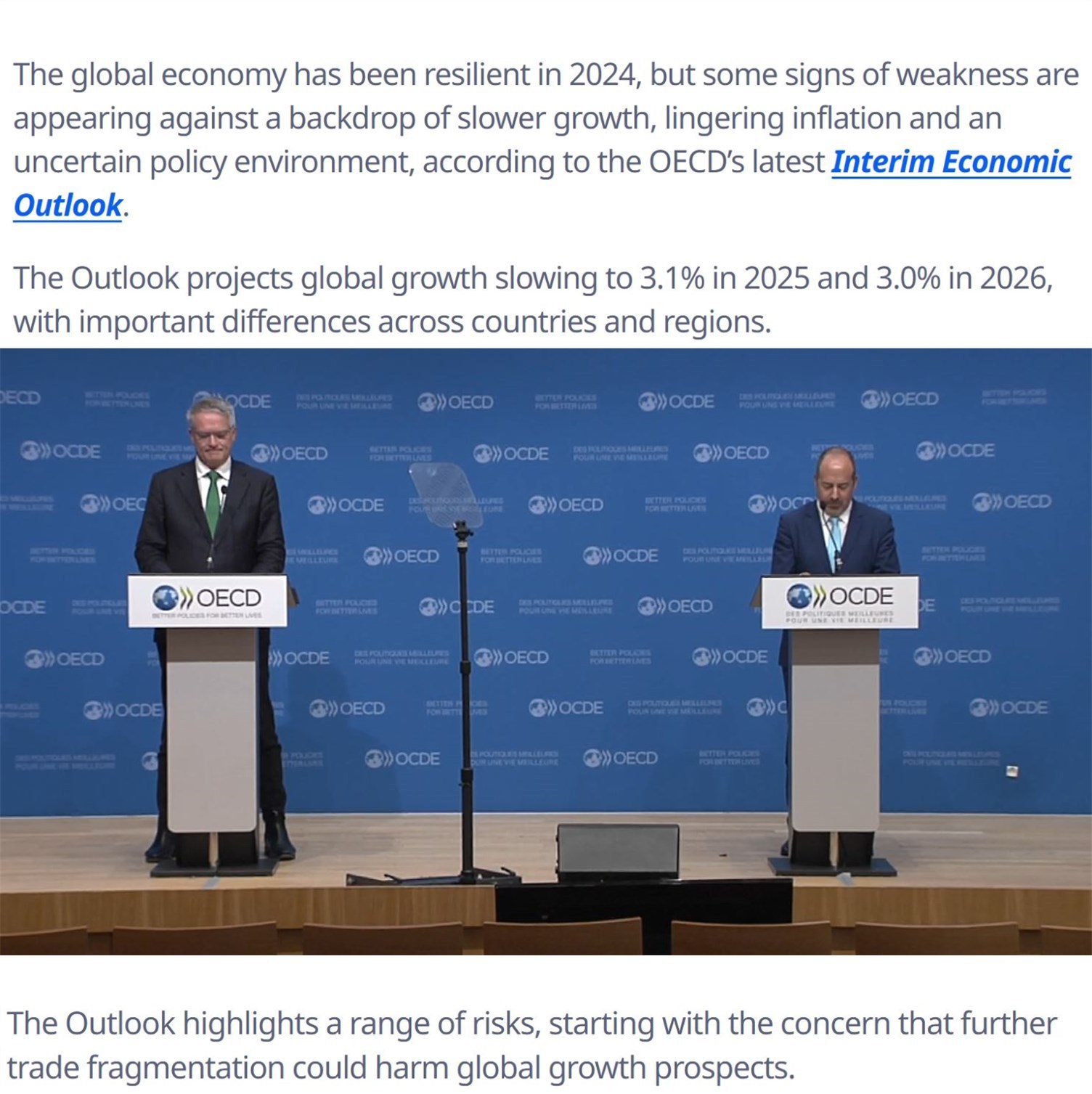 △经济合作与发展组织(经合组织)17日发布中期经济展望报告,预计2025年和2026年全球经济将分别增长3.1%和3.0%,较去年12月预测值分别下调0.2和0.3个百分点。报告强调了全球经济面临的一系列风险,首要风险就是贸易壁垒的增加。