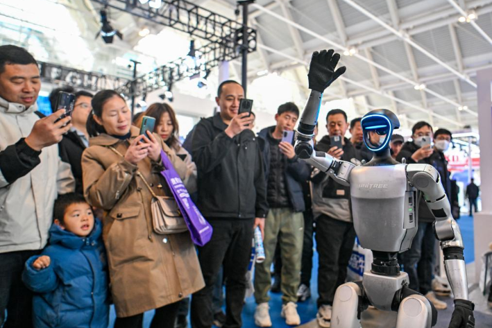 3月6日,在国家会展中心(天津),宇树科技带来的一款人形机器人现场表演。新华社记者 孙凡越 摄