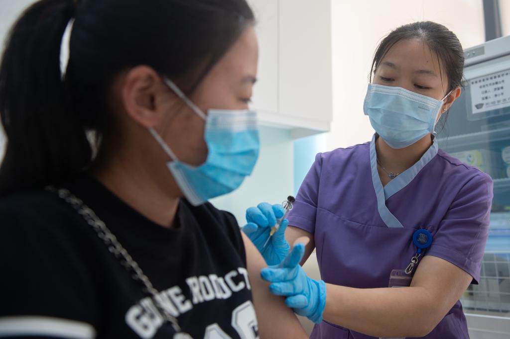 2020年4月3日,博鳌超级医院的护士给一位女士接种HPV疫苗。 新华社记者 张丽芸 摄