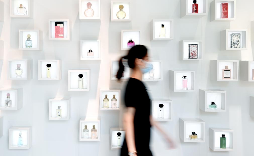 2021年4月19日,消费者从海南博鳌免税店的香水柜台前经过。新华社记者 郭程 摄