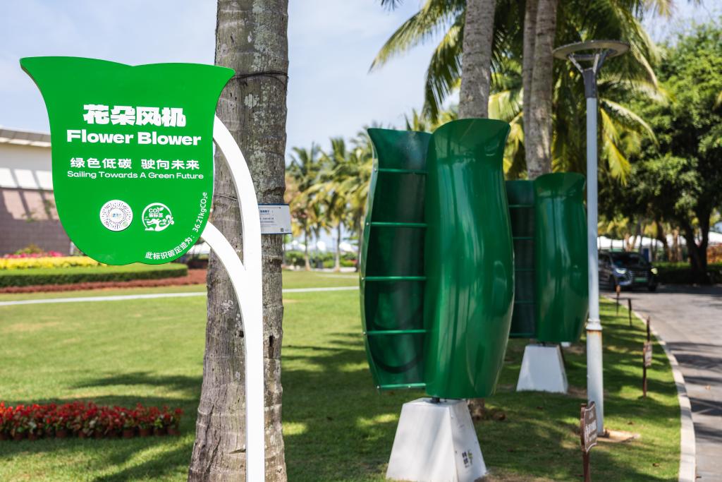 这是2024年3月27日拍摄的博鳌近零碳示范区内的花朵风机。花朵风机用来收集风能,是岛内可再生能源利用项目之一。新华社记者 曹梦瑶 摄