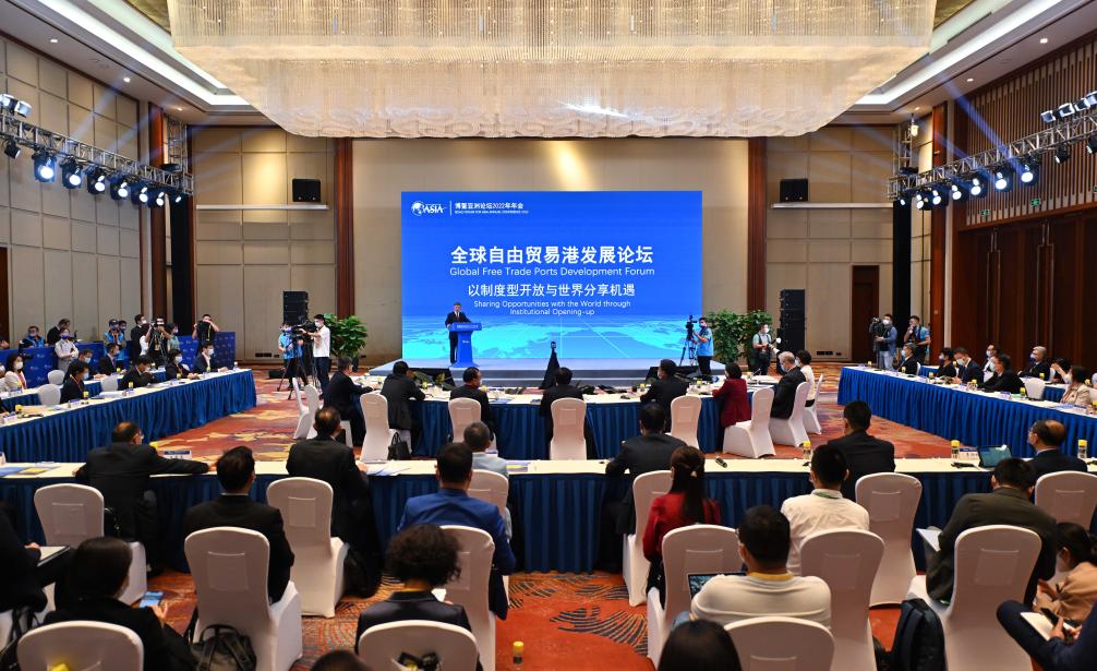 2022年4月21日,博鳌亚洲论坛2022年年会举行“全球自由贸易港发展论坛”。与会嘉宾就如何提升自由区(港)的国际竞争力等话题展开交流。新华社记者 郭程 摄