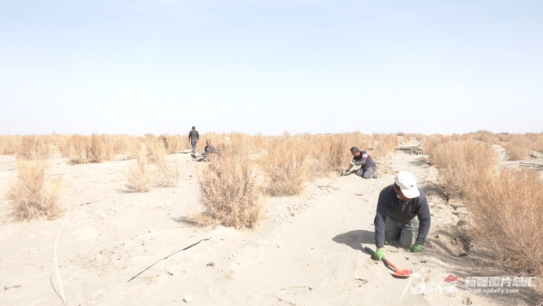 数据显示,2024年,地区完成防沙治沙面积275.75万亩,完成计划任务的126.04%,其中塔克拉玛干沙漠边缘阻击战完成114.72万亩,完成计划任务的121%。第六次全国荒漠化和沙化调查结果显示,地区荒漠化和沙化土地面积“双缩减”,实现了从“沙进人退”到“绿进沙退”的历史性转变。 固沙增绿 富民兴业 3月的阿克苏,绿意渐浓。走进位于沙雅县盖孜库木乡的万亩梭梭治沙示范基地,放眼望去,成片的梭梭覆盖在无边的沙地上,生机盎然。任朋辉走进梭梭林,蹲下身扒开梭梭根部细看肉苁蓉长势,脸上露出一丝欣慰的笑容。