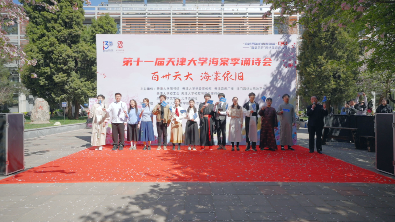 活动尾声,全体表演者合唱《天津大学校歌》,歌声与海棠花一同绽放。以美育人、以美化人、以美培元。一百三十载风雨兼程,天津大学如一面高扬的旗帜,始终屹立于中国高等教育的前沿高地。这场诗会借助网络,成为一堂生动且别具一格的美育思政课。它以艺术为媒介,用美滋养心灵,以思想启迪未来,激励着天大学子传承百年学府精神,担当青春使命,也让更多人接受美的熏陶和思想的洗礼,让美育与思政的力量跨越时空,深入人心。