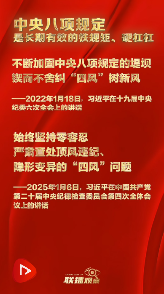 根据党中央统一部署,当前,深入贯彻中央八项规定精神学习教育已在全党范围内全面启动、有序开展。 中央八项规定是我们党进入新时代加强作风建设的关键一招。深入贯彻落实中央八项规定精神,再次向全党全社会释放出“作风建设永远在路上”的强烈信号。我们要以此次学习教育为契机,把中央八项规定精神作为长期有效的铁规矩、硬杠杠,以作风建设新成效汇聚起推动改革发展的强大力量。 总监制丨骆红秉 魏驱虎 监 制丨王敬东 主 编丨李璇 编 辑丨刘禛 视 频丨杜安琪 视 觉丨陈腾 校 对丨蔡纯琳 鲁杨 宋春燕 任佳 毛长志 李英卓 出 品丨中央广播电视总台央视网 支 持丨中国互联网发展基金会 |