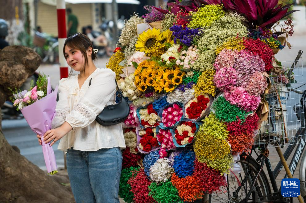 3月25日,一名女子在越南河内街头与“自行花车”合影。