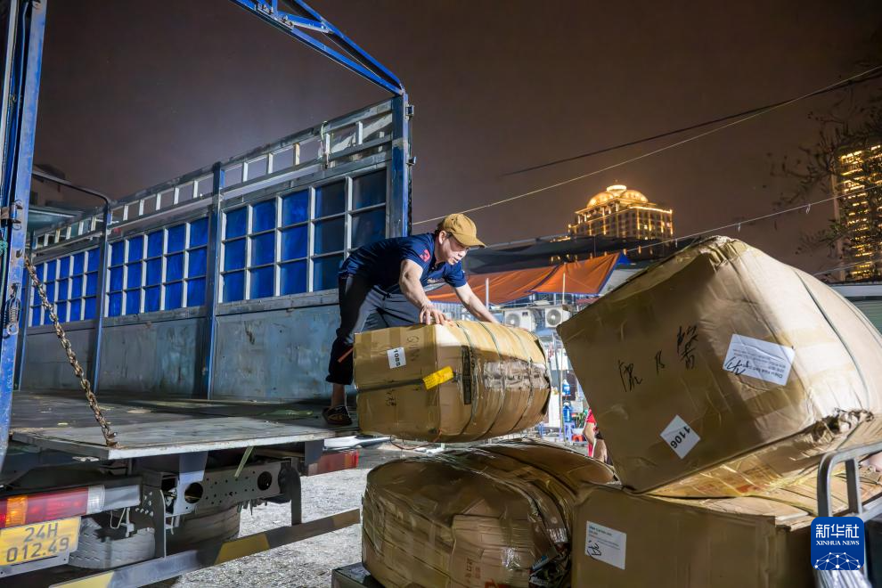 3月28日,在越南河内广霸花市,商贩将产自中国云南的鲜花从货车上搬运下来。