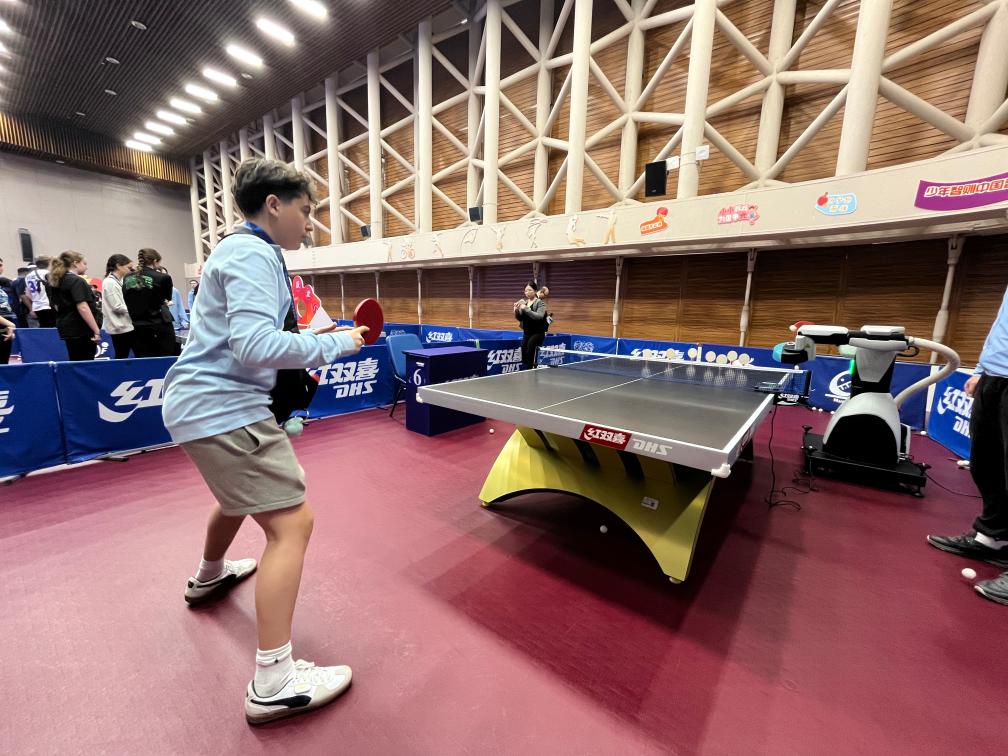 4月12日,美国青少年在上海国际乒联博物馆和中国乒乓球博物馆的乒乓球发球机器人前体验接球。新华社记者有之炘摄 二楼体验区的乒乓球发球机器人前,学生们轮番挑战。曾在美国全国U14乒乓球比赛中拿下过第7名的瑞恩·特洛伊·李挥拍上阵,飞快的反应速度引发伙伴们此起彼伏的欢呼和掌声。 普尔斯维尔高中的伊恩·斯科特·哈珀捧着体验纪念证书与同伴兴奋合影:“相比匹克球,乒乓球节奏更快,对反应速度和击球精度要求更高。我喜欢这里的氛围,处处彰显着体育的魅力!”