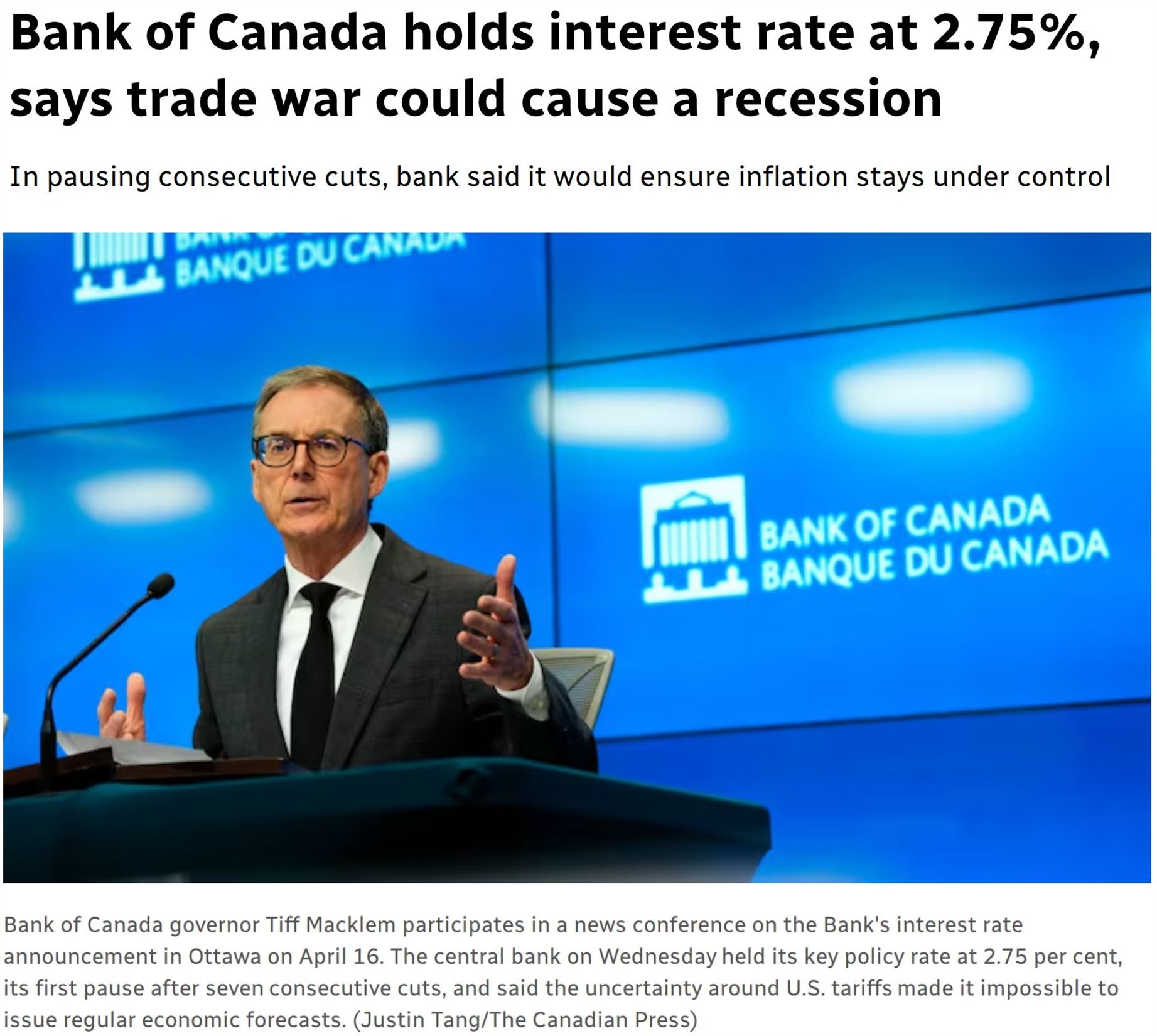 △路透社报道截图(题图为欧洲央行行长拉加德) 多名专家指出,在通胀下降、经济增长乏力的背景下,如果贸易摩擦状况进一步恶化,不排除欧洲央行被迫采取更激进降息措施的可能。 无论各国央行的决策如何,各国货币政策管理者都对美国单边贸易政策表达了担忧。 当地时间16日,加拿大央行——加拿大银行宣布将基准利率维持在当前2.75%的水平不变。在该机构看来,美国贸易政策方向的重大转变和关税政策的不可预测性增加了不确定性、拖累经济增长前景并推高通胀预期。 加拿大银行上个月刚刚宣布将基准利率下调25个基点至2.75%,并表示尽管加拿大经济今年开局强劲,但贸易紧张局势加剧和美国关税政策可能减缓加拿大经济活动步伐,并增加通胀压力。