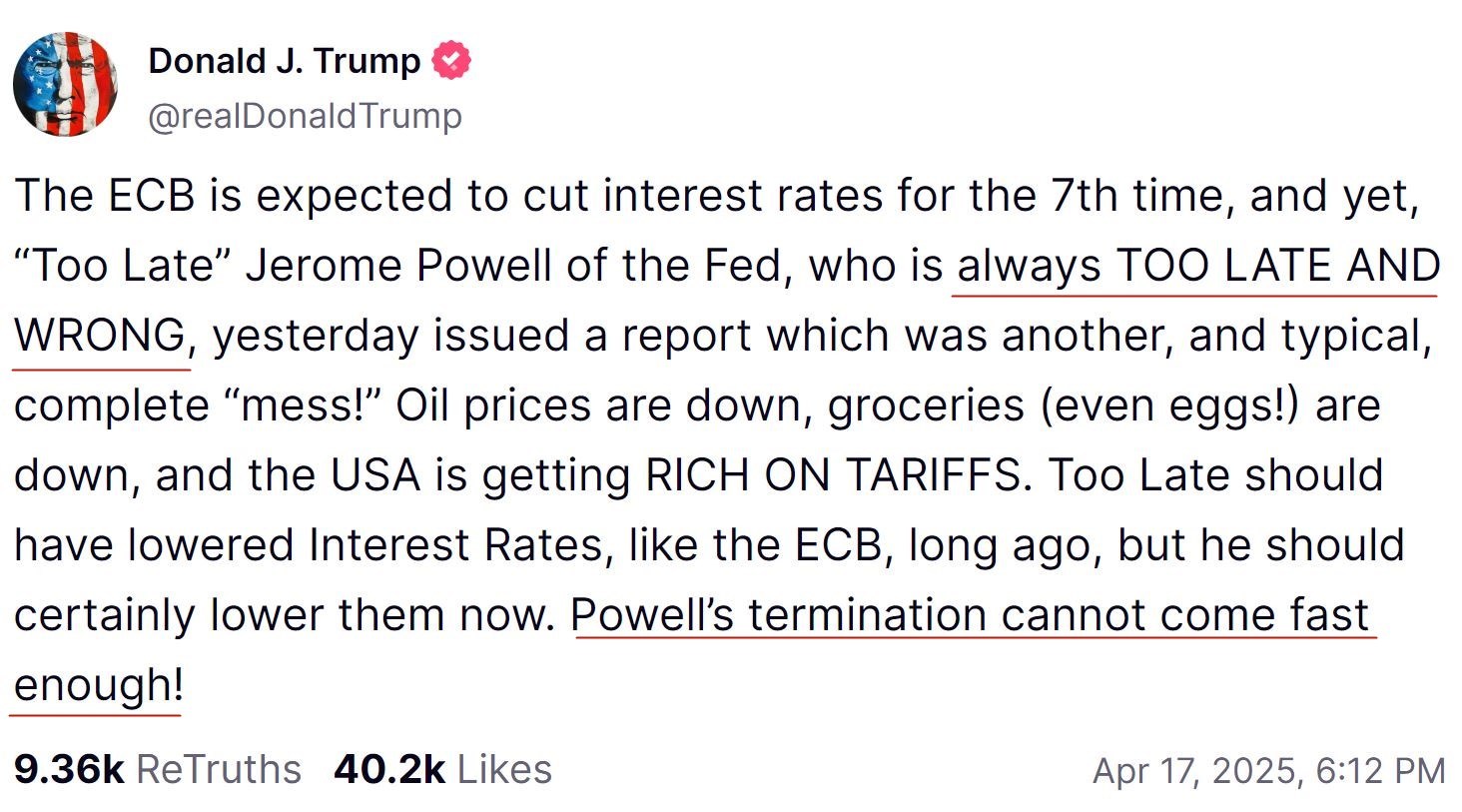 △美国“政府卫星有线电视台”报道:鲍威尔4月16日在出席芝加哥经济俱乐部活动时强调,美联储永远不会受到任何政治压力的影响。 一次次被美联储“掌门人”怼回来,特朗普17日又在社交媒体上发文称,鲍威尔的行动总是“又迟又错”。他说,行动太慢的鲍威尔早该像欧洲央行一样降息了,现在更应该立即降息。他还说,鲍威尔“越早走人越好”。