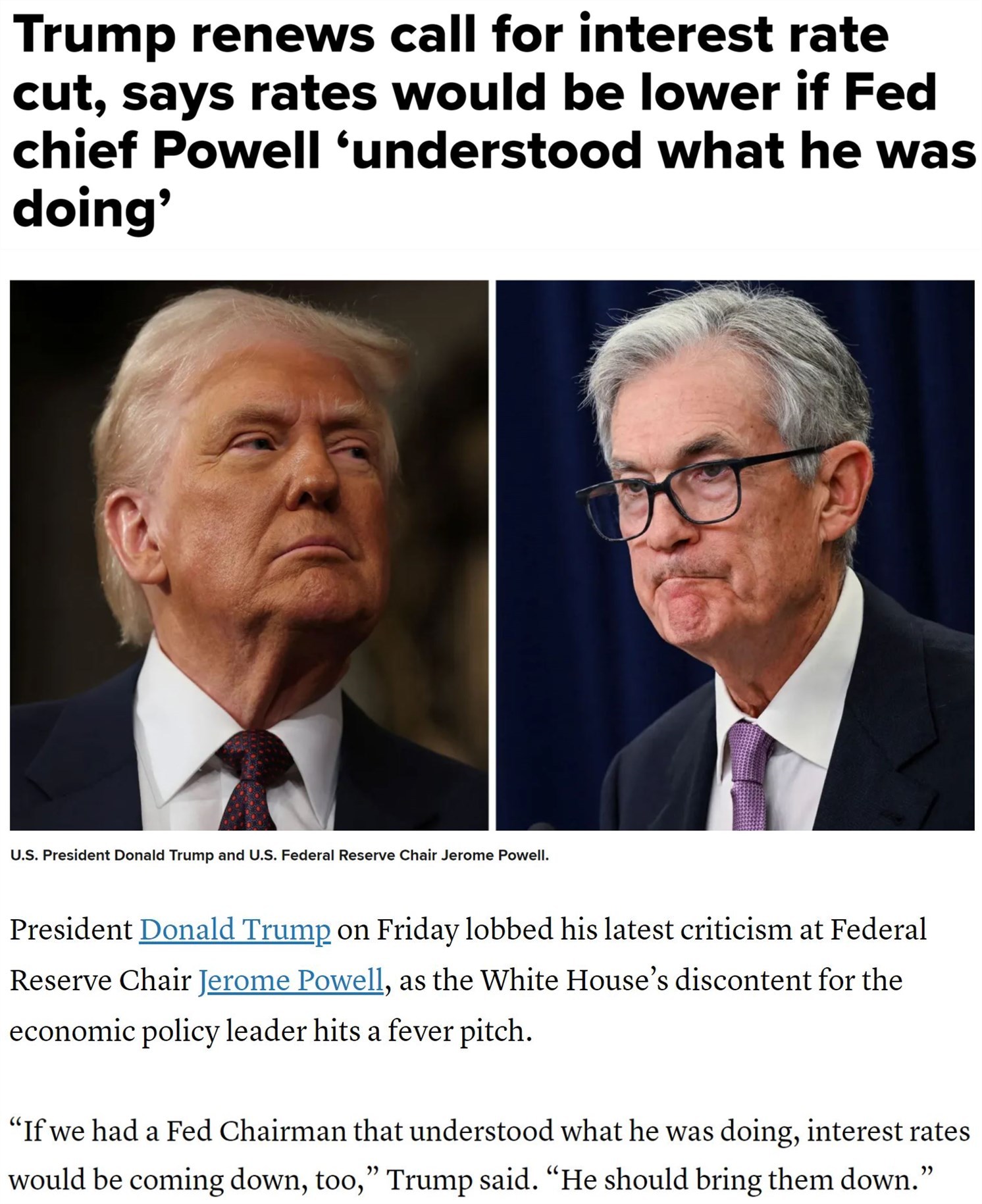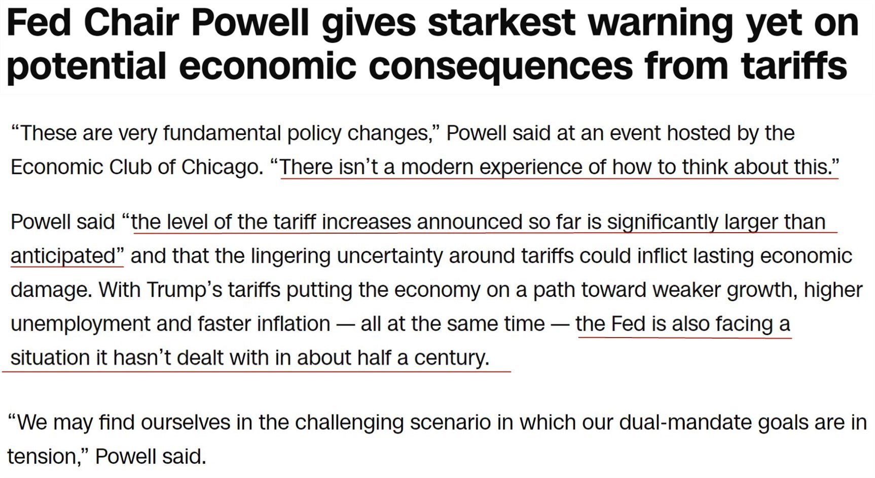 △特朗普社交媒体帖文截图 此前一天,鲍威尔在芝加哥经济俱乐部发表讲话时指出,美国政府已宣布的关税上调幅度远超预期水平,其带来的经济影响同样可能超出预期,令美联储货币政策制定面临更棘手的局面。 “大多数时候,当经济疲软时,通胀率会低、失业率会高。这两种情况都需要降低利率来应对。所以大多数时候,(控通胀和保就业)这两个政策目标并不矛盾。但在当前(关税政策)的冲击影响下,我们观察到的指标显示失业率和通胀率将同时上升。但我们的政策工具在同一时间点只能用于解决一个问题。”