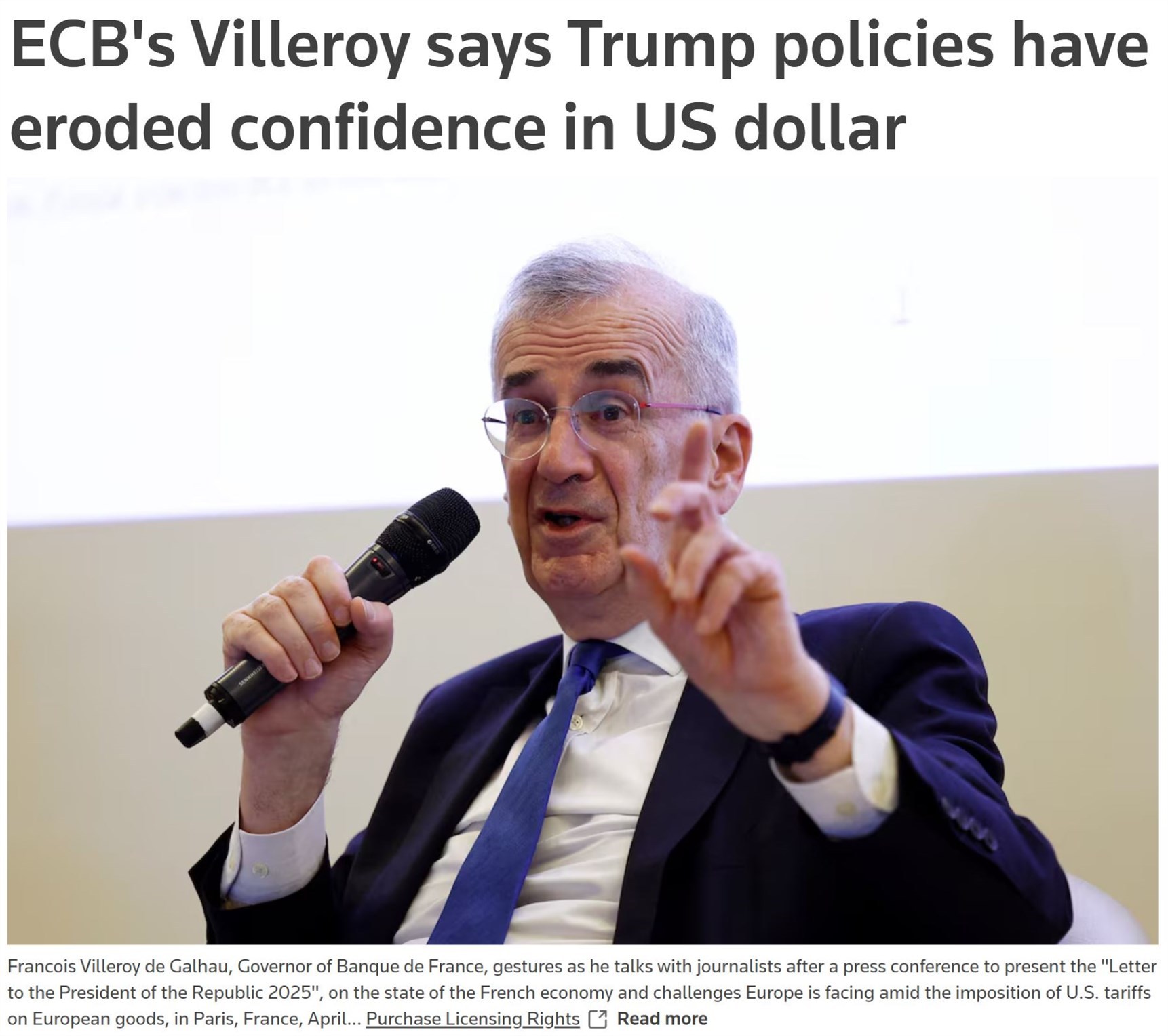 △《日本经济新闻》网站报道截图(题图为日本央行行长植田和男) 法国央行行长维勒鲁瓦近日对媒体的“吐槽”道出了全球货币政策管理者的心声。 在维勒鲁瓦看来,特朗普政府的保护主义政策及其反复无常的贸易立场,正在动摇美元作为全球主要储备货币的信任基础,损害市场对美元的信心。