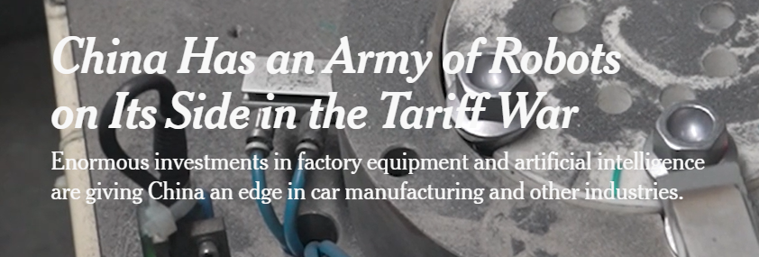 《纽约时报》网站近期的一篇文章聚焦中国制造业领域的机器人大军,认为它们彻底改变了中国的制造业,使得中国工厂有能力将其出口的许多产品价格保持在较低水平,并在应对特朗普的高关税、应对贸易战方面具有优势。