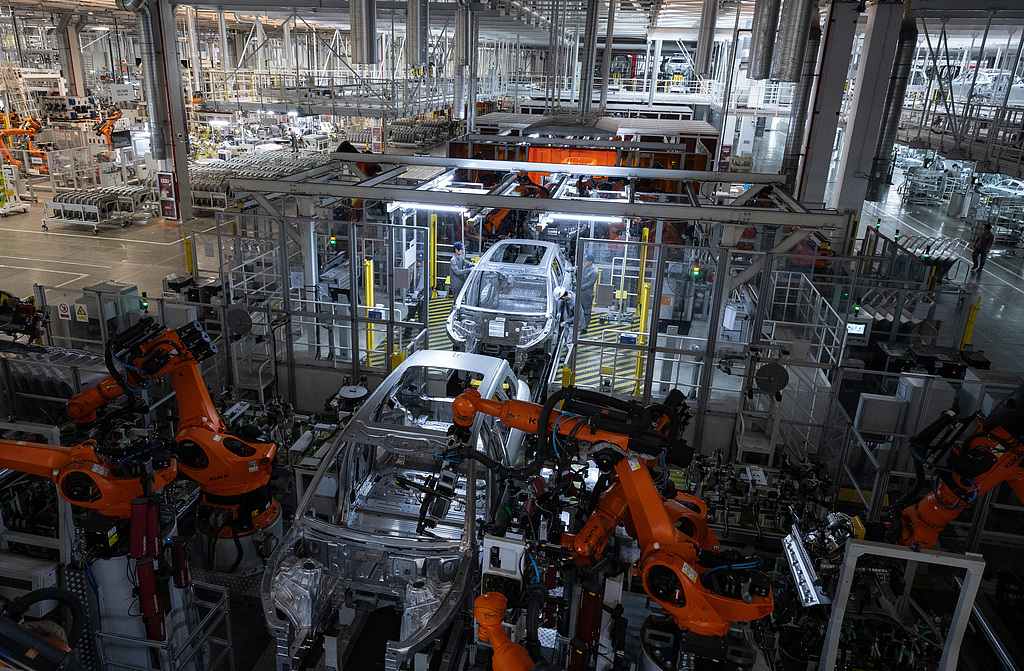 2025年4月,一家中国电动车制造商的生产线上,机械臂正在作业(图自视觉中国)
