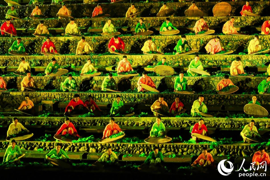 《印象大红袍》演出将传统技艺与现代舞美技术相融合,融入武夷茶农摇青的场景。人民网 李唯一摄
