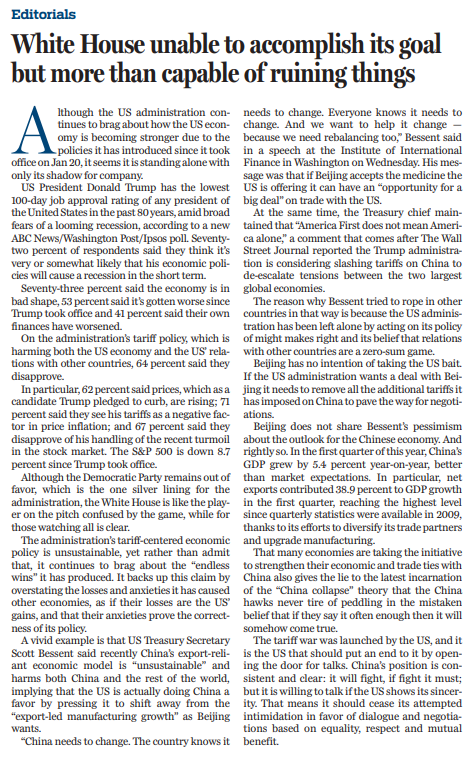 本文编译自《中国日报》4月29日社论 原文标题:White House unable to accomplish its goal but more than capable of ruining things 出品:中国日报社论编辑室 中国日报中文网 |