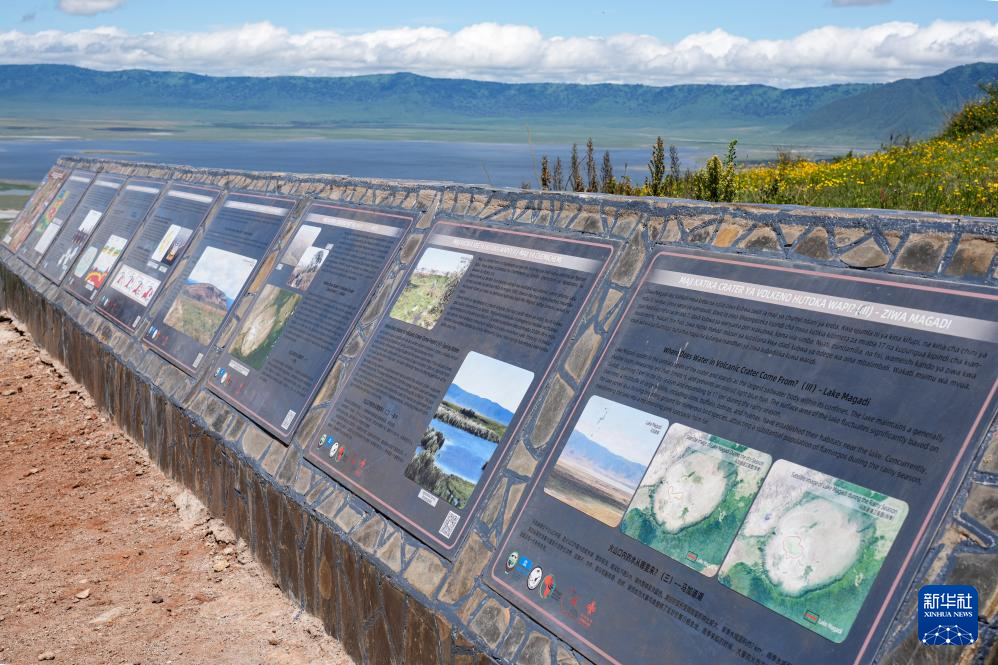 这是4月26日在坦桑尼亚阿鲁沙恩戈罗恩戈罗-伦盖地质公园拍摄的中企修建的解说牌。新华社记者 李亚辉 摄