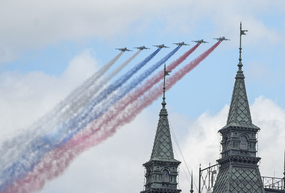 克里姆林宫斯巴斯基钟楼上,巨大的自鸣钟指针指向10时,悠扬的钟声响彻红场。俄罗斯军乐队奏响《神圣的战争》乐曲,仪仗队护卫俄罗斯国旗、伟大卫国战争胜利旗入场。