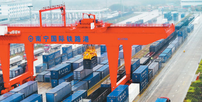广西南宁国际铁路港是中国铁路出口越南集散中心,也是中国西部陆海新通道的重要节点。图为南宁国际铁路港一片繁忙景象。