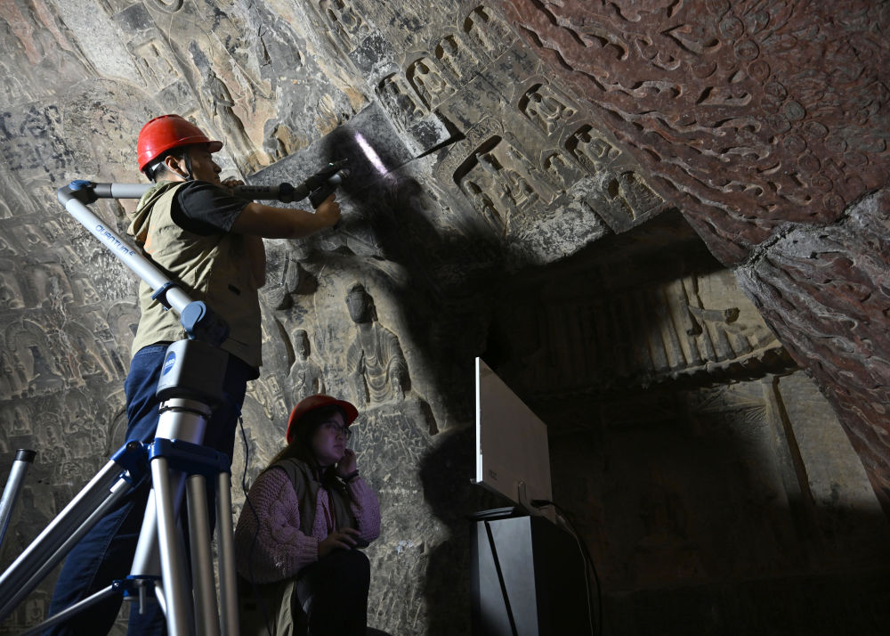 2025年4月9日,龙门石窟研究院工作人员在古阳洞使用关节臂扫描仪对像龛进行数字化扫描。