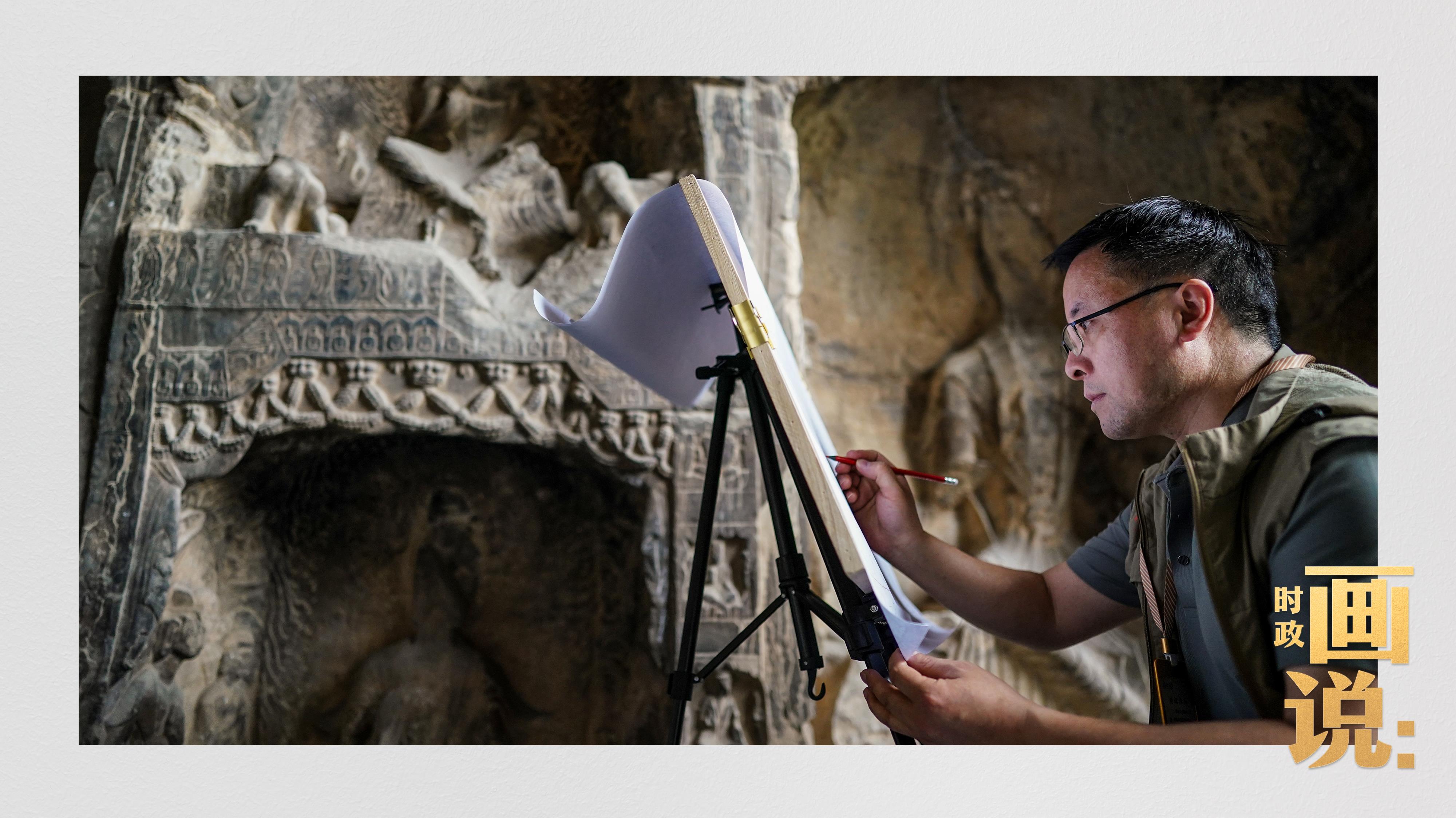 △工作人员在对石刻病害情况进行详细记录