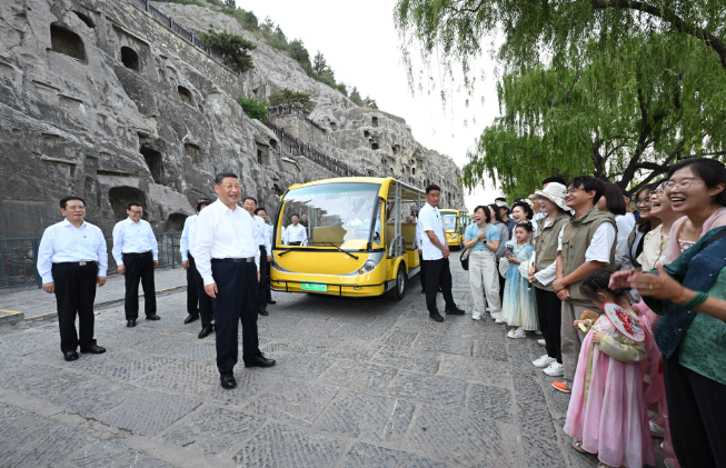 离开龙门石窟之际,总书记伫立草木丰茂的伊水之畔,遥望西山千龛拱列,尽览博大文明气度。粼粼波光的伊水,静静流淌。对岸,北魏的錾痕、盛唐的凿印,崖壁间镌刻着恒久的文明印记。