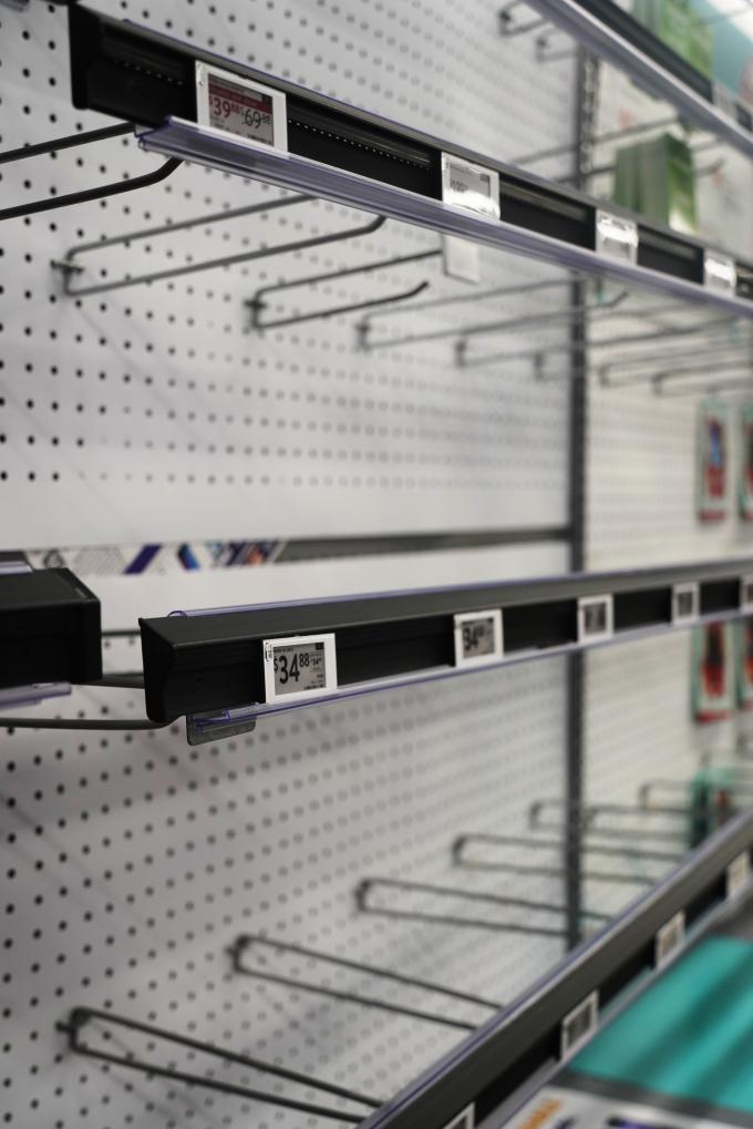 这是5月21日在美国加利福尼亚州旧金山湾区圣莱安德罗的一家沃尔玛超市拍摄的空荡的货架。新华社记者 吴晓凌 摄