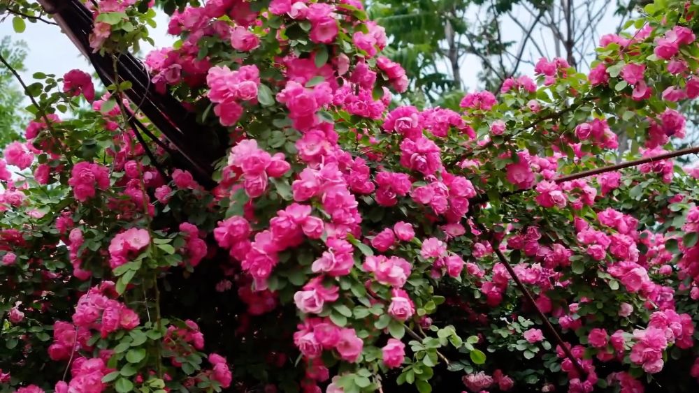 五月芳菲醉人间,3000余株藤蔓月季在沟渠头村的巷道间翻涌成花海。