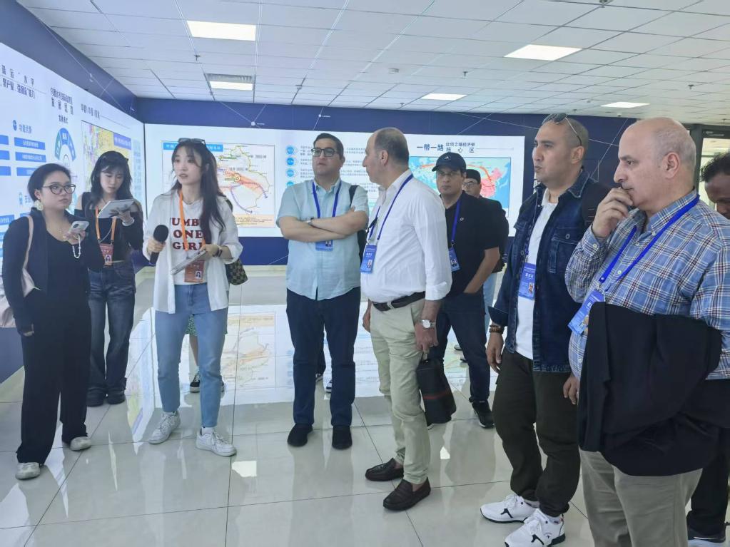 5月26日,媒体团外宾在新疆乌鲁木齐国际陆港区了解中欧班列发运情况。新华社记者顾煜 摄