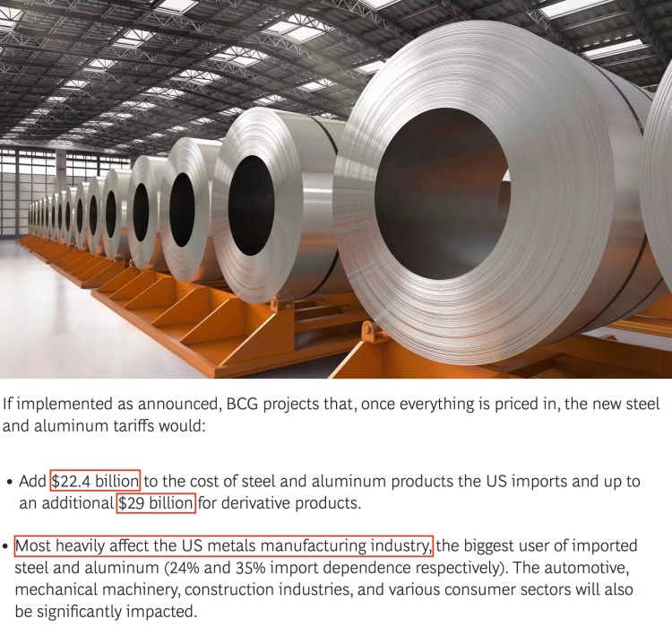 △英国广播公司报道截图 美国政府意在重振制造业的举措不仅没有如它期望的那样提升国内金属产量,反而让更多企业陷入困境。 根据美国波士顿咨询公司的测算,仅在3月生效的25%钢铝关税就会让美国进口钢铁和铝产品的成本增加224亿美元,衍生产品的成本增加290亿美元。 这对美国进口钢铁和铝的最大用户——金属制造业(包括结构性金属制品、金属工具、集装箱等产品的制造)影响最为严重,同时对与金属相关的汽车、机械、建筑和各种消费行业也将产生重大影响。
