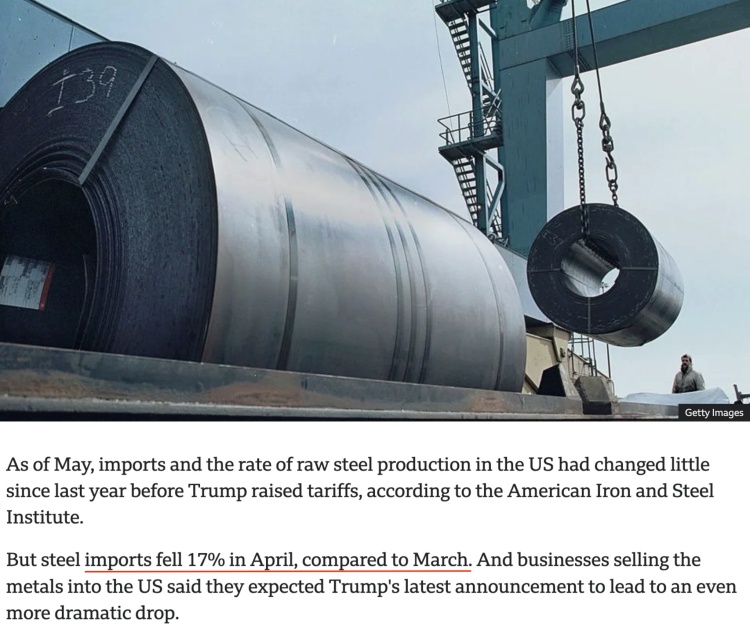 △美国有线电视新闻网报道截图 这次也一样。 此前美国已从3月12日开始对所有美国进口的钢铁和铝征收25%的关税,但根据美国钢铁协会的数据,截至5月,美国的钢铁进口量和粗钢产量与去年相比变化不大。但与3月相比,4 月美国钢铁进口量下降了17%。