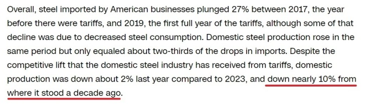 △美国全国公共广播电台网站报道截图 “各种商品无一例外地会比以前更贵” 至于为什么要将税率翻倍,白宫给出的理由是——25%的关税不足以“保护”美国钢铝产业,必须进一步提高。 由于美国在钢铝贸易方面长期存在贸易逆差,对外钢铝依赖度过高会“威胁美国国家安全”已经成了特朗普的口头禅。 虽然他在第一任期就曾以这个理由对进口钢铁和铝分别加征了25%和10%的关税,但研究显示,这些关税并没有给美国带来产业复兴,去年美国国内钢铁产量较十年前反而减少了近10%,全球竞争力也在下降。