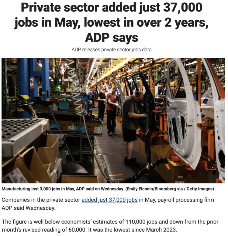 △美国消费者新闻与商业频道报道截图 还是在4日,美国自动数据处理就业服务公司公布的报告显示,5月美国私营部门仅新增3.7万个就业岗位,较4月的6万个大幅放缓,也远低于市场预测的11.5万,创下2023年初以来的最低水平。