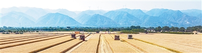 联合收割机在山西省运城市盐湖区解州镇曲村麦田里收割小麦。 薛 俊摄(新华社发) |
