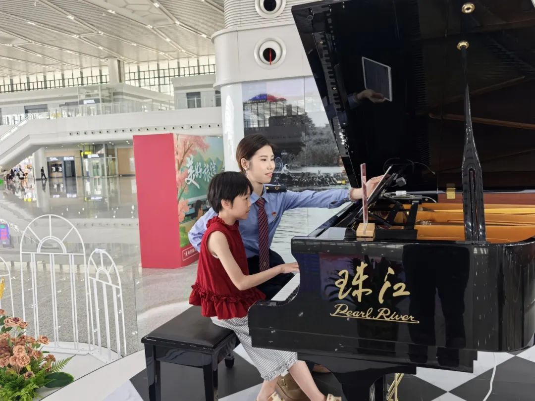 在人来人往的车站内,一位小旅客正与工作人员在音乐驿站合奏钢琴曲。 2 中国文明网网友@邹阳
