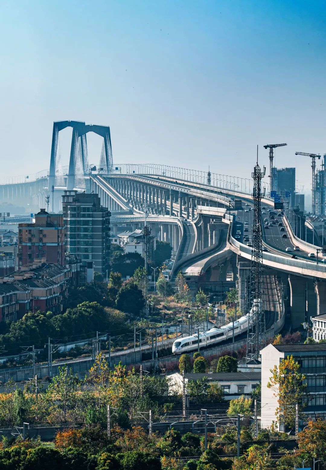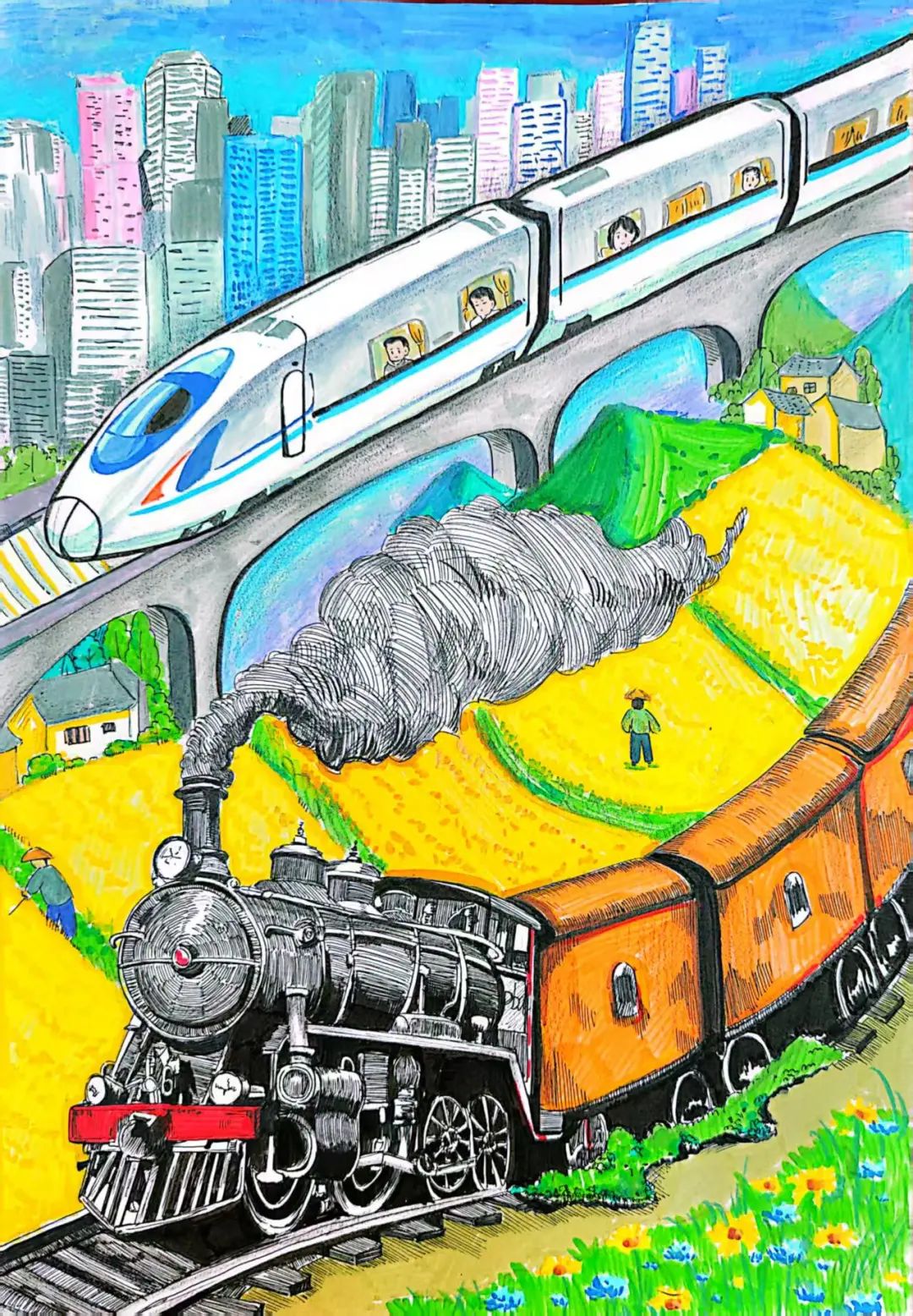 芜湖长江三桥凌空飞架,串联宁安高铁、宁芜铁路与合杭高铁,勾勒出立体交通网络。画面以钢铁动脉为笔触,记录城市经济腾飞的轨迹:宁安高铁融入长三角“1小时交通圈”,合杭高铁贯通南北,宁芜铁路支撑物流枢纽建设。每一条轨道的延伸,都是对城市活力的提升;每一次提速,都在重塑长三角一体化格局中的皖江支点。 6 新华社客户端网友@新华HpvA0g 火车与火箭同框。 画笔和AI呈现的中国铁路 1 中青报@高庆彪