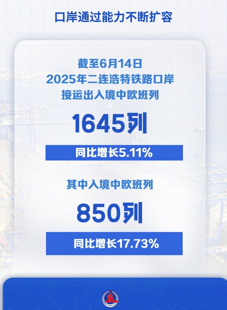 ■口岸通过能力不断扩容 二连浩特口岸是中欧班列中通道进出境的唯一铁路口岸,截至6月14日,2025年二连浩特铁路口岸接运出入境中欧班列1645列,同比增长5.11%,其中入境中欧班列850列,同比增长17.73%。