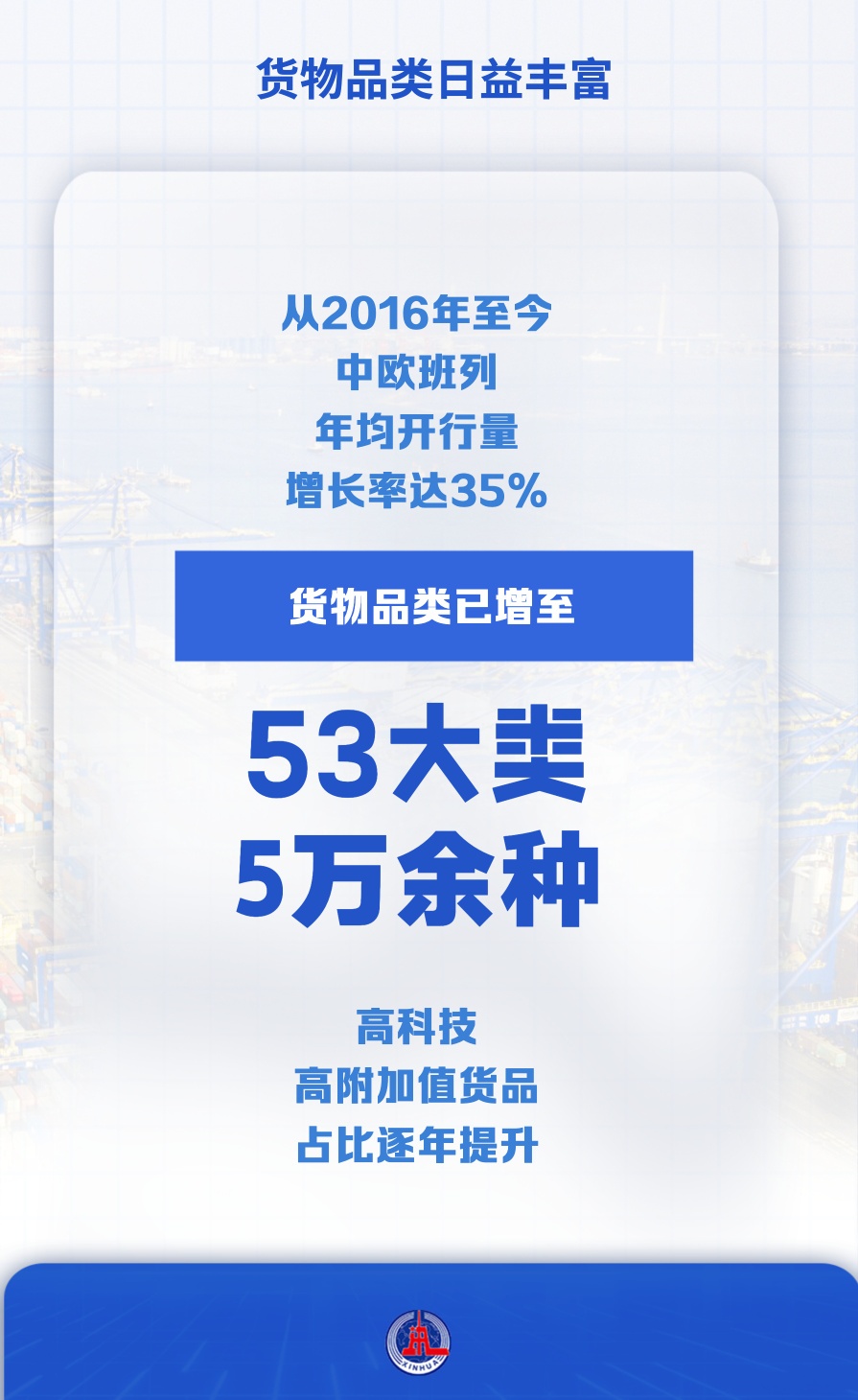 ■货物品类日益丰富 从2016年至今,中欧班列年均开行量增长率达35%,货物品类已增至53大类5万余种,高科技、高附加值货品占比逐年提升。
