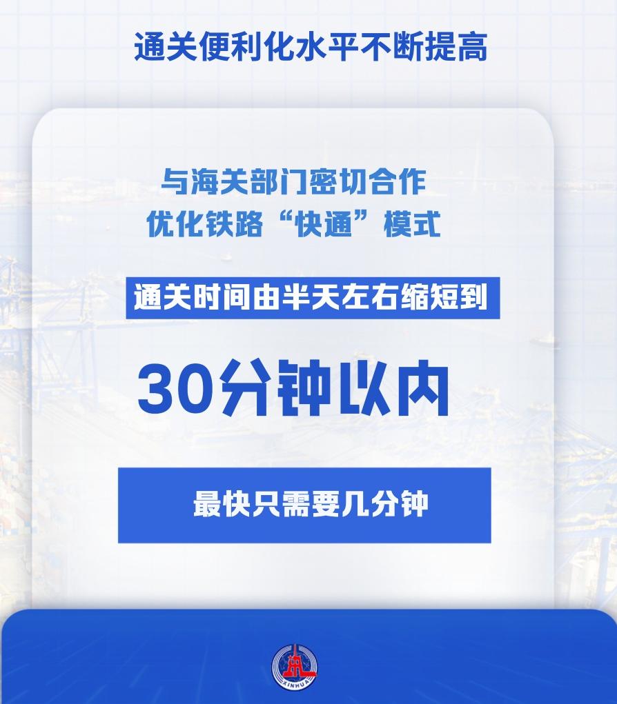 ■通关便利化水平不断提高 与海关部门密切合作,优化铁路“快通”模式,通关时间由半天左右缩短到30分钟以内,最快只需要几分钟。