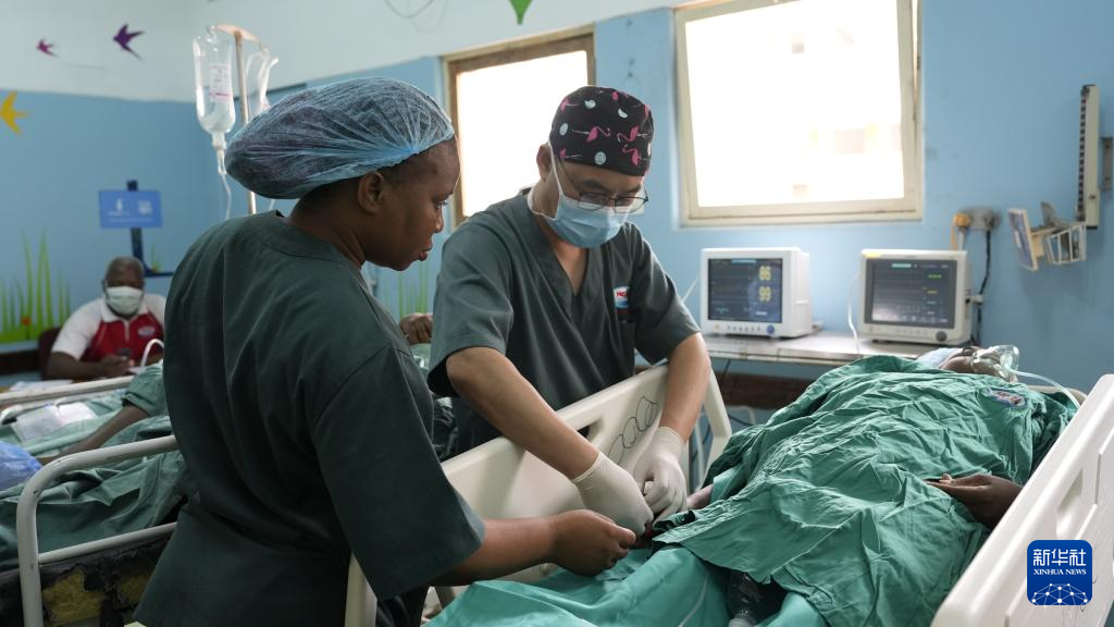 4月11日,在莫桑比克马普托,中国援莫医疗队医生凌勇(右)和当地医护人员对病人进行术后护理。新华社记者 刘杰 摄 |