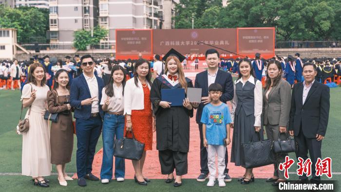 6月27日,留学生马丽文在毕业典礼上与从老挝前来的亲人合影留念。 (受访者供图) 在广西科技大学27日举行的毕业典礼上,老挝留学生马丽文成为全场焦点:她的父母、兄弟等十位亲人跨国而来,见证这一重要时刻。“当家人手捧鲜花向我走来,我紧紧拥抱住他们,感谢他们支持我的梦想。”马丽文说。 2018年,怀揣着“成为一名救死扶伤的医生”这一理想,马丽文选择到中国学习。“中国的医疗技术和教育水平非常先进,是理想的‘取经’之地。”她坦言。 克服语言关,是马丽文来中国学习的首要任务。“我们班里只有我一名外国学生,中国学生都很热情,帮助我尽快融入当地生活。”如今,马丽文早已能说一口流利的汉语。 对马丽文而言,在中国医院实习的经历尤为珍贵。她在急诊科、内科、外科轮转学习,逐步参与临床实践。第一次站上手术台的紧张感,她仍记忆犹新:“心跳得飞快,多亏带教老师指导我完成缝合、打结等操作……” 毕业后,马丽文计划回老挝的医院轮岗,将在中国学到的医术服务于老挝民众。 同样怀抱梦想来中国求学的,还有来自印度尼西亚的兄妹林建全和林婉詠。两人在华人家庭长大,赴华留学是家族情感的延续。