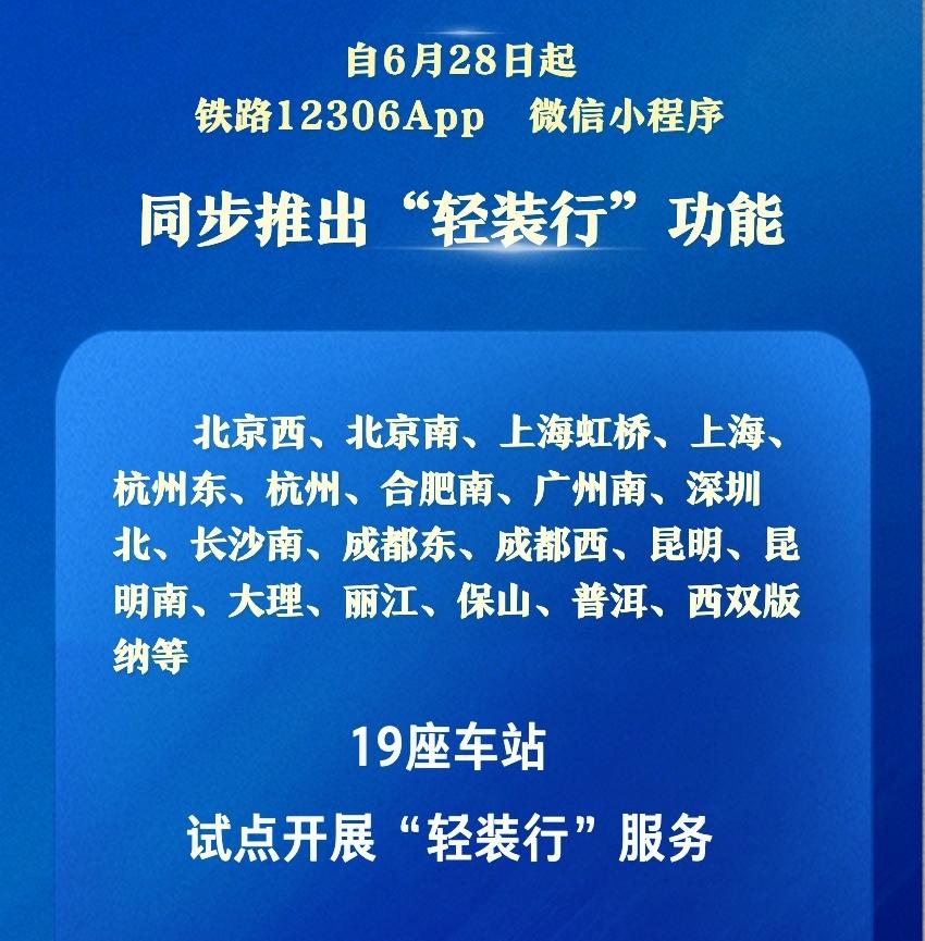 ■铁路:推出“轻装行”服务 全国19座车站试点 全国铁路运行图开启了“暑运模式”,列车提速、线路新增、服务优化……不少人已经开始计划“坐着火车逛中国”了。 就在几天前,全国19座车站试点开展同城行李搬运服务,为旅客提供“门到站”“站到门”同城行李搬运服务,大件行李不用随身带,坐火车出行更方便了。