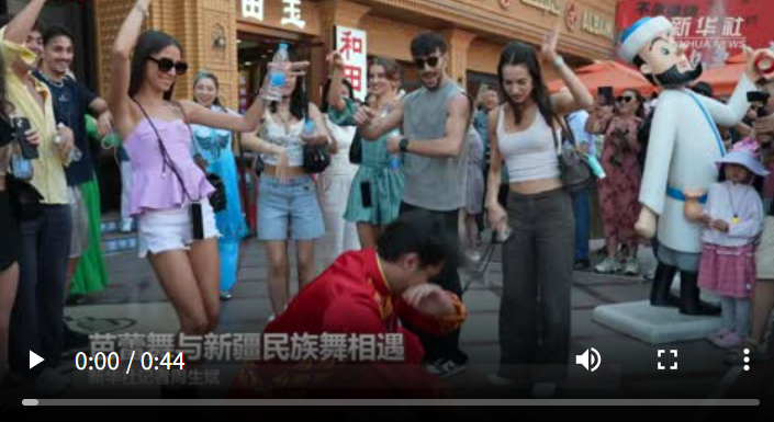 7月22日,第七届中国新疆国际民族舞蹈节间隙,意大利米兰芭蕾舞团成员来到位于乌鲁木齐的新疆国际大巴扎参观游览。在看到新疆民族舞蹈演员精彩表演后,意大利演员们跳起了芭蕾舞《罗密欧与朱丽叶》片段,令在场各地游客和观众大饱眼福。