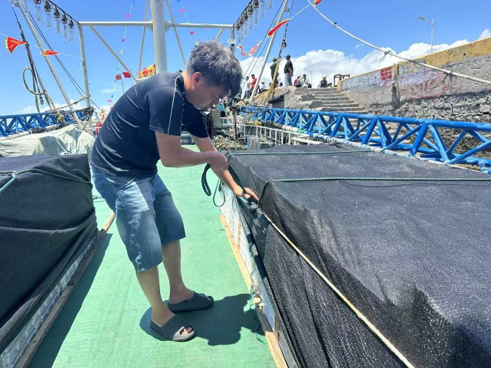 8月16日上午,闽惠渔00177号船长陈聪莆进行开渔前的最后准备工作。新华社记者 庞梦霞 摄