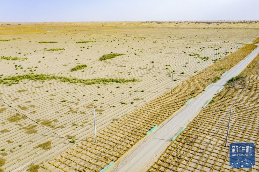 ↑ 新疆尉犁县境内的塔里木河南岸防沙治沙区的罗布麻种植区(左)和固沙草方格(右)(无人机照片,9月20日摄)。新华社记者 陈朔 摄