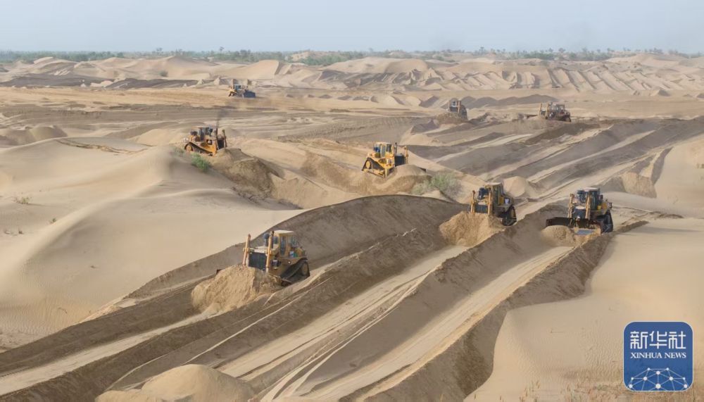 ↑ 5月22日,在新疆尉犁县境内的塔里木河南岸防沙治沙区,大型机械在平整沙丘(无人机照片)。新华社发(汪志鹏 摄)