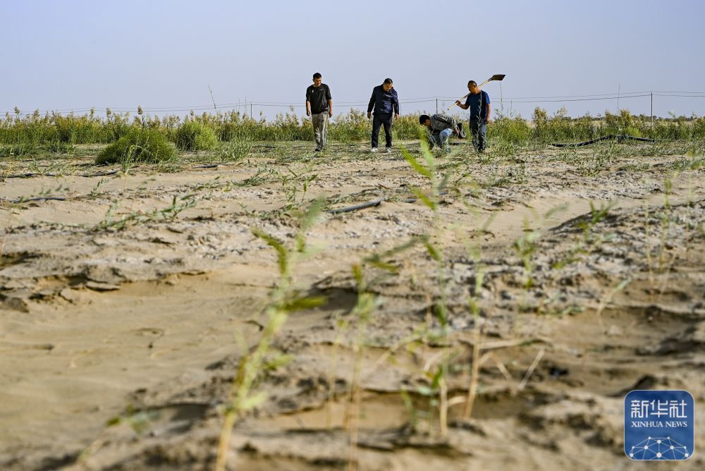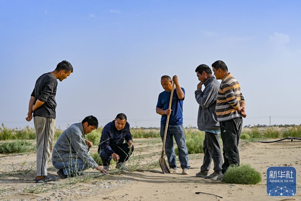 ↑ 9月20日,新疆尉犁县国有林管理局护林员艾力·尼亚孜(左二)和工作人员一起查看罗布麻长势。新华社记者 陈朔 摄