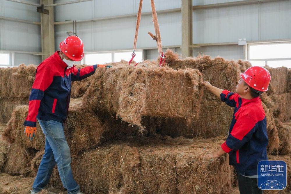↑ 9月20日,在新疆尉犁一家服装公司的罗布麻纤维脱胶车间,工人吊送原材料。新华社发(汪志鹏 摄)
